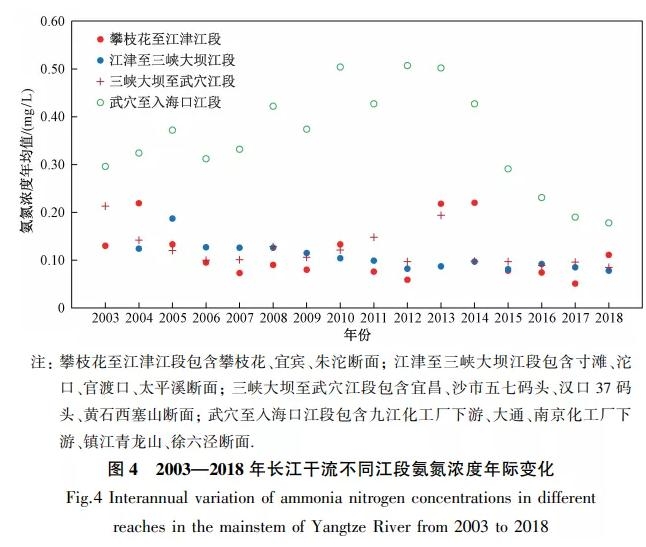 圖 4為2003—2018年長(zhǎng)江干流不同江段氨氮濃度年際變化。由圖 4可見(jiàn):武穴(位于中下游分界點(diǎn)湖口上游約70 km)至入海口江段的氨氮濃度變幅最大,2003—2012年基本呈上升趨勢(shì),之后至2018年顯著下降,由2012年的0.51 mg/L降至2018年的0.18 mg/L,下降約65%.對(duì)該江段所含各斷面濃度的變化分析表明,九江化工廠下游斷面氨氮降幅最大,由2012年的0.63 mg/L降至2018年的0.13 mg/L,下降約79%;大通、南京化工廠下游和鎮(zhèn)江青龍山斷面在2013—2018年下降分別為53%、78%、77%;徐六涇斷面氨氮濃度從2010年起總體呈下降趨勢(shì),由2010年的0.41 mg/L降至2018年的0.22 mg/L,下降約為46%.上游和下游變幅遠(yuǎn)小于武穴至入??诮?,僅個(gè)別斷面變幅較大,如三峽庫(kù)區(qū)江段的重慶寸灘斷面2010—2018年總體呈下降趨勢(shì),由2010年的0.16 mg/L降至2018年的0.06 mg/L,下降達(dá)63%. 2011年起,中游江段的沙市五七碼頭斷面氨氮濃度呈下降趨勢(shì),由2011年的0.28 mg/L降至2018年的0.10 mg/L,下降約60%.上游攀枝花至江津段氨氮濃度從2013年起也呈明顯下降趨勢(shì)。