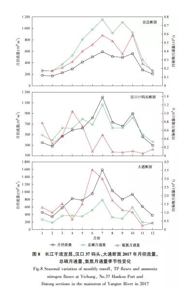 c 近18年來(lái),長(zhǎng)江水量未呈明顯增大或減小趨勢(shì),但輸沙量大幅下降??偭啄晖颗c年徑流量密切相關(guān),5—10月總磷月通量較高。 2001—2006年宜昌斷面、漢口37碼頭斷面氨氮年通量大幅下降,2013—2018年,大通斷面氨氮年通量呈明顯下降趨勢(shì)。