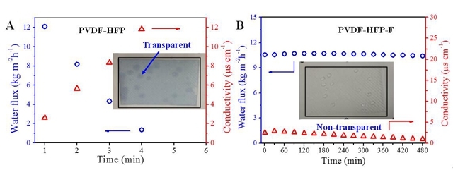 圖2:膜蒸餾處理含表面活性劑鹽水測(cè)試:A疏水膜;B雙疏膜