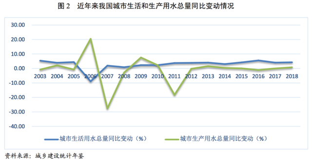 從具體子行業(yè)來看,除2006年居民生活用水有所波動外[3],其他年份居民生活用水總量增速保持穩(wěn)定,生產(chǎn)用水在2012年之前波動較大,之后年度增速變動與生活用水趨同。從具體波動來看,生產(chǎn)用水波動與我國水務政策密切相關(guān),2006年,我國在《十一五規(guī)劃綱要》中首次提出“節(jié)能減排”使得我國生產(chǎn)用水量同比下降,加之經(jīng)濟危機因素影響,生產(chǎn)用水量在2007年和2008年同比增速為負,之后隨著經(jīng)濟發(fā)展用水量同比增速又有所回升。2011年,十二五規(guī)劃出臺《“十二五”節(jié)能減排綜合性工作方案》,使得用水總量同比增速呈現(xiàn)大幅下降,但政策之后保持相對穩(wěn)定。根據(jù)《國家節(jié)水行動方案》要求,到2022年,萬元國內(nèi)生產(chǎn)總值和工業(yè)增加值用水量較2015年分別降低30%和28%,預期我國生產(chǎn)用水效率將有所增長,進而對沖因經(jīng)濟總量的持續(xù)增長對生產(chǎn)用水總量需求的增加,工業(yè)生產(chǎn)整體用水總量預期保持穩(wěn)定。