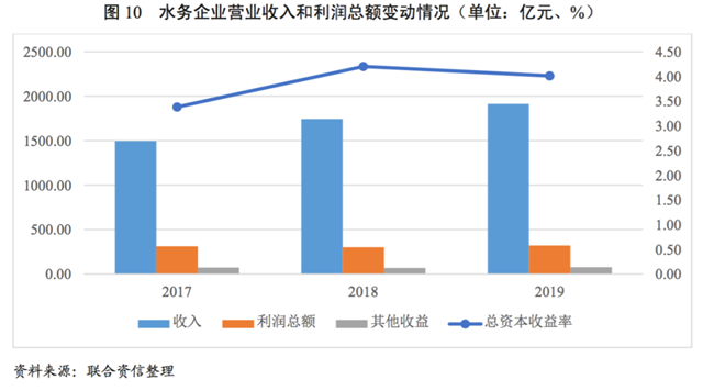 2017-2019年,聯(lián)合資信口徑的水務樣本企業(yè)[5]實現(xiàn)營業(yè)收入合計分別1494.62億元、1742.67億元和1912.98億元,年均復合增長13.13%。同期,水務企業(yè)利潤總額合計分別為311.91億元、300.47億元和320.07億元,年均復合增長1.30%。水務企業(yè)營業(yè)收入和利潤總額整體上呈增長趨勢,主要系水務工程施工、水環(huán)境整治、污水處理業(yè)務增加等因素綜合影響所致。2020年一季度,水務企業(yè)平均實現(xiàn)營業(yè)收入7.09億元,同比增長1.25%。同期,水務企業(yè)有息債務規(guī)模增長,利息費用對利潤總額侵蝕加劇,受此影響,2020年一季度,水務企業(yè)平均實現(xiàn)利潤總額0.71億元,同比下降28.14%。2019年水務企業(yè)其他收益對利潤總額的貢獻由2018年的22.46%上升至23.50%,仍保持在較高水平,水務企業(yè)利潤總額對政府補助的依賴程度仍較高。2017—2019年,水務企業(yè)平均總資本收益率波動增長,分別為3.38%、4.20%和4.01%。受股權(quán)投資收益變動、相關(guān)成本以及融資財務費用增加等影響,水務企業(yè)整體盈利能力有所波動。未來隨著在建水務項目逐漸完工運營,產(chǎn)能得以釋放,預計行業(yè)整體盈利能力有望提升。