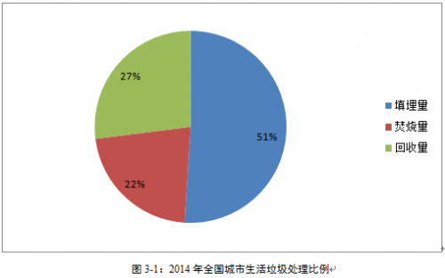 目前我國(guó)城市生活垃圾處理模式較為落后,形成了以填埋為主,焚燒為輔的終端處置格局。以2014年為例,當(dāng)年全國(guó)城市生活垃圾產(chǎn)生總量24090.94萬噸,其中填埋量12286.4萬噸,占比51%;焚燒量5300萬噸,占比22%;回收量6504.54萬噸,占比27%(見圖3-1)。