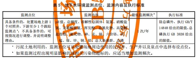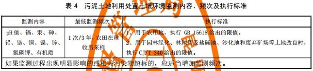 污泥填埋處置的,應(yīng)按GB 18599、GB 16889開展環(huán)境影響跟蹤監(jiān)測;污泥土地利用處置的,處置過程結(jié)束后應(yīng)按表5開展環(huán)境影響跟蹤監(jiān)測,監(jiān)測周期不應(yīng)低于10年;采用其他處置方式時,則執(zhí)行與其對應(yīng)的相關(guān)標(biāo)準(zhǔn)。