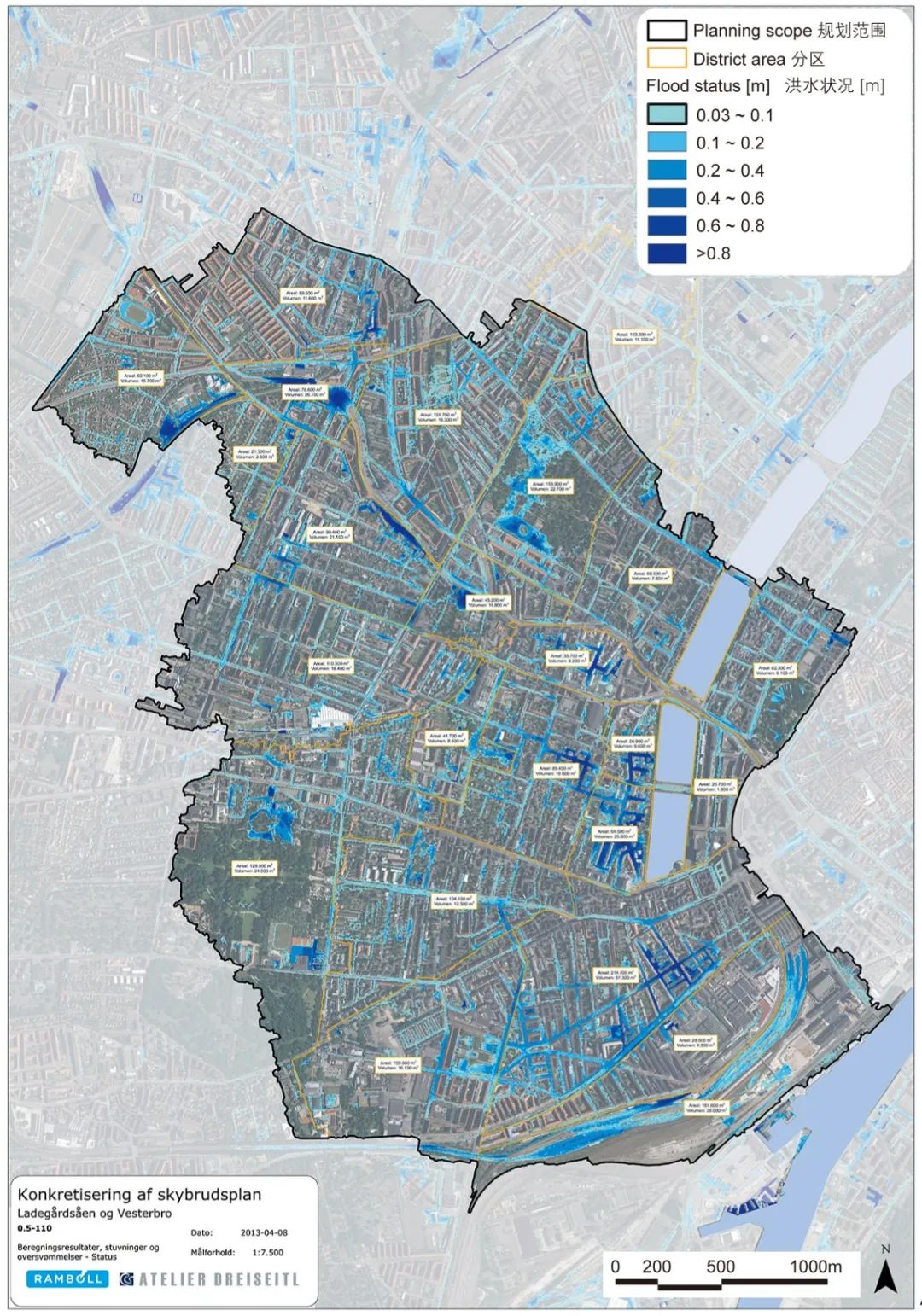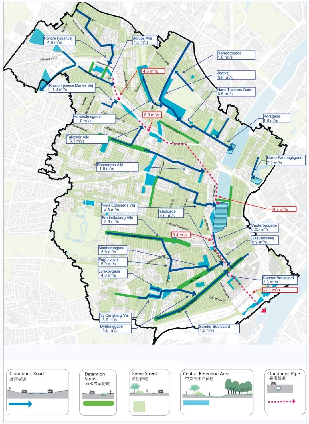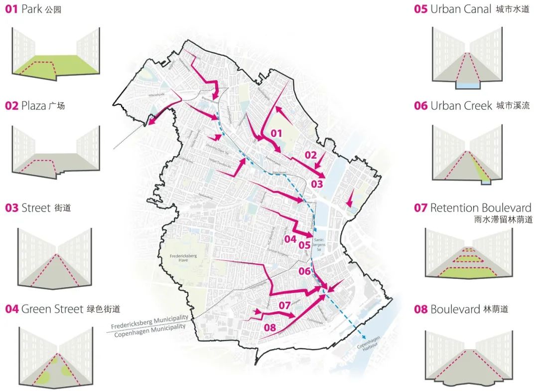 整合后的規(guī)劃將為城市帶來諸多額外效益。隨著對總體規(guī)劃愿景的細(xì)化,哥本哈根城區(qū)被分為8個區(qū)域,每個區(qū)域作為一個獨立的集水區(qū),均需要更為細(xì)致的具體規(guī)劃方案。安博負(fù)責(zé)其中4個區(qū)域的具體實施方案設(shè)計,其中包括暴雨街道、雨水滯留街道、綠色街道的具體設(shè)計,及如何通過這些方案實現(xiàn)提升城市宜居性的總體目標(biāo)。