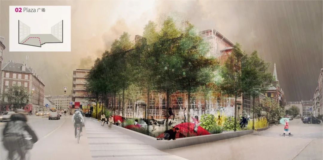 在海綿城市設(shè)計中,對城市宜居性的提升應(yīng)與對氣候的適應(yīng)并重。作為此方面的典范,丹麥?zhǔn)锥几绫竟械谋┯攴揽卦敿?xì)規(guī)劃提出了一套雄心勃勃的計劃,旨在幫助城市免受未來的暴雨之害。總體規(guī)劃確立后,哥本哈根市政府開始著手為城市的各個分區(qū)制定具體的海綿城市景觀設(shè)計方案。此次景觀設(shè)計將不僅能夠應(yīng)對日益頻繁的極端暴雨天氣,還可以大幅度提升城市的宜居性,造福今時與后世的居民。此外,整套規(guī)劃的總體耗資也低于傳統(tǒng)工程方案。