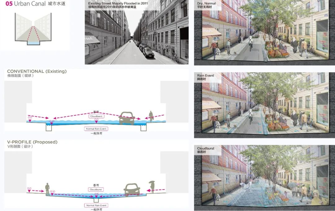 哥本哈根暴雨防控詳細(xì)規(guī)劃采用截然不同的方式來設(shè)計這些大道。新設(shè)計的林蔭道將道路剖面變?yōu)椤癡”形,使中間的綠化低地形成一條巨大的海綿滯流帶。暴雨天氣時,雨水將從兩側(cè)的建筑物流向中間綠化帶。索恩德大道在暴雨天氣下的徑流流量將達(dá)到3.3m3/s。而在正常降雨及無雨天氣時,低洼的綠帶則可成為周邊居民的休閑場所。