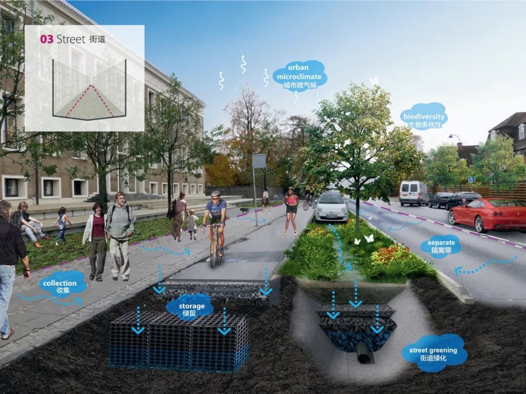 另一個用來緩解極端暴雨影響的具體策略是雨水滯留街道。這些街道通常是位于低洼、脆弱區(qū)域上游的次級道路,通過街道內(nèi)部的設(shè)計來創(chuàng)造巨大的蓄水空間。在不對交通產(chǎn)生重大妨礙的情況下,這些次級道路通??杀桓脑斐捎晁疁艚值?。通過增加洼地、透水鋪裝等方式實現(xiàn)對雨水的滯留,并可以凈化雨水,從而實現(xiàn)對地下含水層的補給。