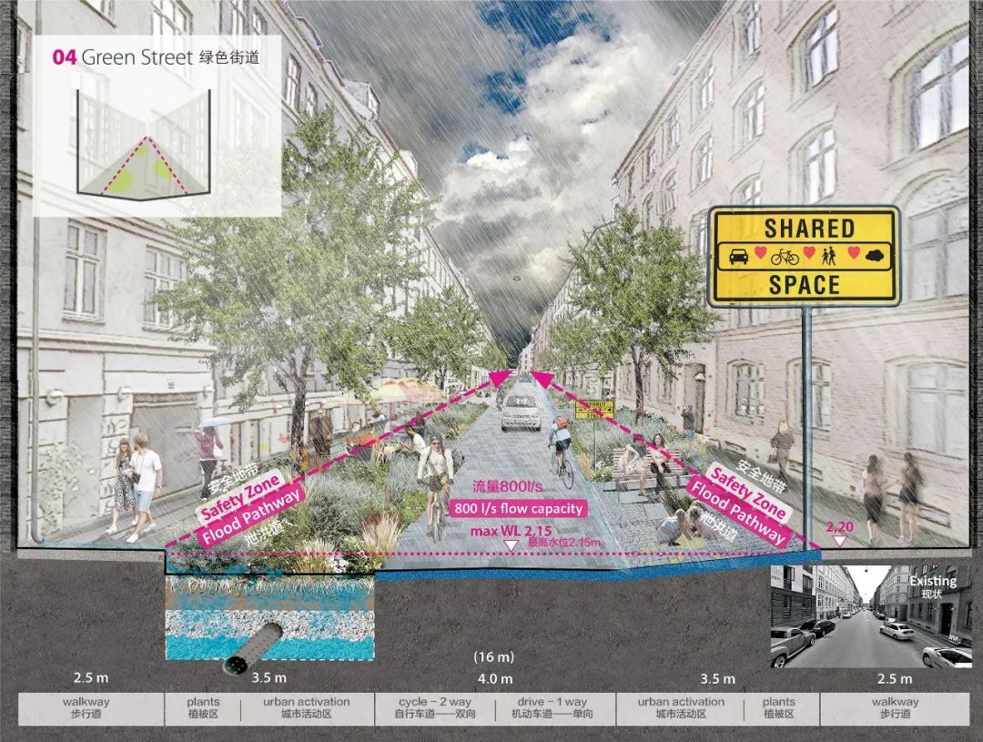 在這份詳細(xì)規(guī)劃中,多功能區(qū)域發(fā)揮著舉足輕重的作用。公園與操場等空地可在暴雨天氣時被淹沒,而在無雨的日子作為休閑空間供市民使用。在空間彌足珍貴的高密度城市環(huán)境中,提供可以用于休閑娛樂的多功能空間無疑是極為必要的。此外,這種“海綿”可以成為激活灰色城市空間的引擎。