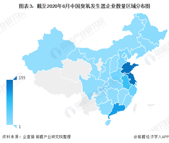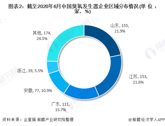 截至2020年6月,通過企查貓查詢得出的709家企業(yè)中,大部分企業(yè)分布在山東、江蘇和廣東地區(qū),三個省份企業(yè)數(shù)量占全國的59.1%。前五省份企業(yè)數(shù)量占全國的75.5%。整體來看,臭氧發(fā)生器行業(yè)區(qū)域市場集中度較高。