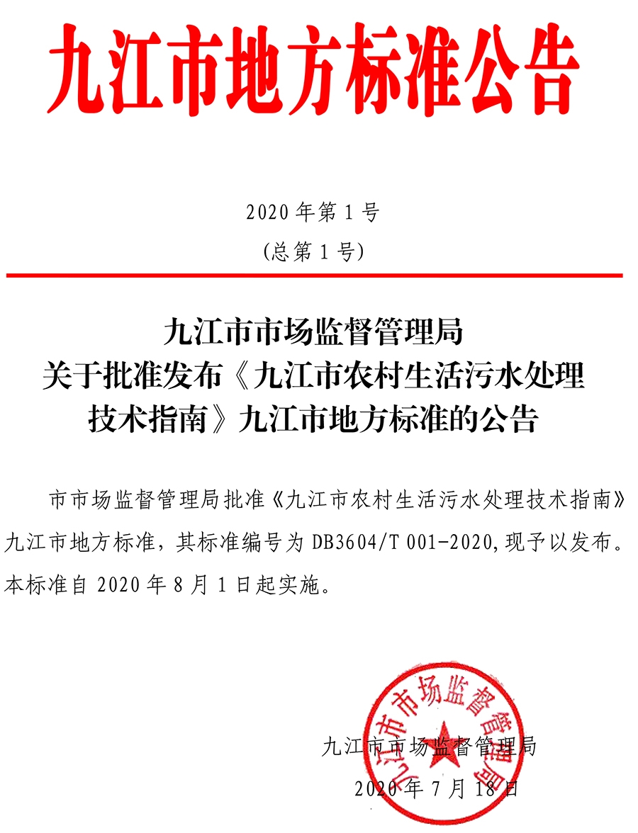 九江市市場(chǎng)監(jiān)督管理局關(guān)于批準(zhǔn)發(fā)布《九江市農(nóng)村生活污水處理技術(shù)指南》九江市地方標(biāo)準(zhǔn)的公告