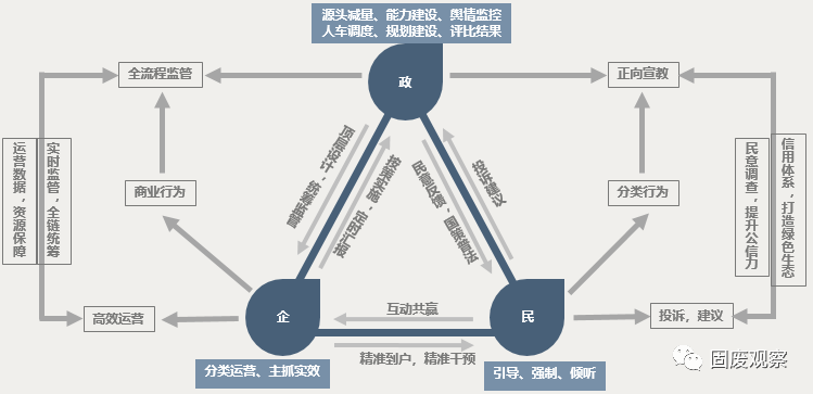 當(dāng)前,政、企、民三方各司其職,共同推進(jìn)垃圾分類。政府層面聚焦頂層規(guī)劃,企業(yè)著力于高效運營,居民端發(fā)動全民參與。聯(lián)運環(huán)境從企業(yè)角度分析了在此情況下,如何在政企民協(xié)同發(fā)展中嵌入信息化系統(tǒng),打造信息化閉環(huán)。