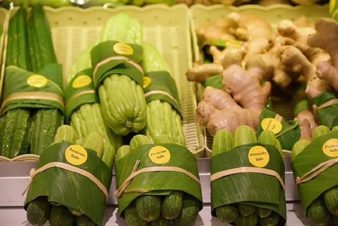 ▲泰國超市中,用香蕉葉代替塑料打包蔬菜。