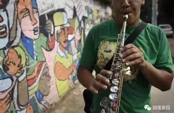 這支薩克斯,是用啤酒瓶蓋、排水管、硬幣以及餐具柄、玉米罐頭和鈕扣做成的。