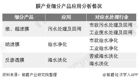 水處理作為膜產(chǎn)業(yè)下游的一個重要應用領域,也是膜材料的主要去向:微濾膜主要應用于污水、廢水處理等領域;超濾膜在污水、廢水處理及回用和給水凈水領域應用廣泛;納濾膜主要應用于純凈水、軟化水、無離子水、海水淡化等方面;而反滲透膜可應用在海水淡化等領域。
