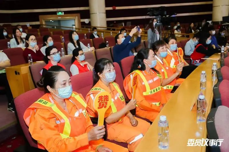 ▲5位環(huán)衛(wèi)工人也受邀來到了委員議事廳直播現(xiàn)場。