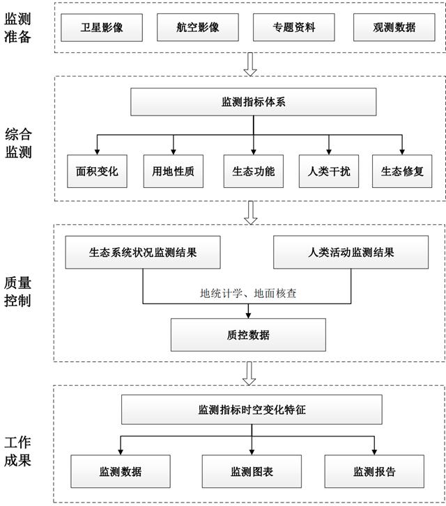 c) 綜合監(jiān)測階段指綜合利用衛(wèi)星遙感、航空遙感和地面調(diào)查觀測方式提取生態(tài)保護紅線面積、用地性質(zhì)、生態(tài)功能、人類干擾活動和生態(tài)修復(fù)治理等。