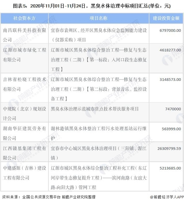 全國公共資源交易平臺數(shù)據(jù)顯示,2020年11月01日-11月24日,共15起社會資本中標(biāo)黑臭水體治理項(xiàng)目,投資額總計(jì)8939.69萬元,其中,包含6個黑臭水體整治項(xiàng)目。