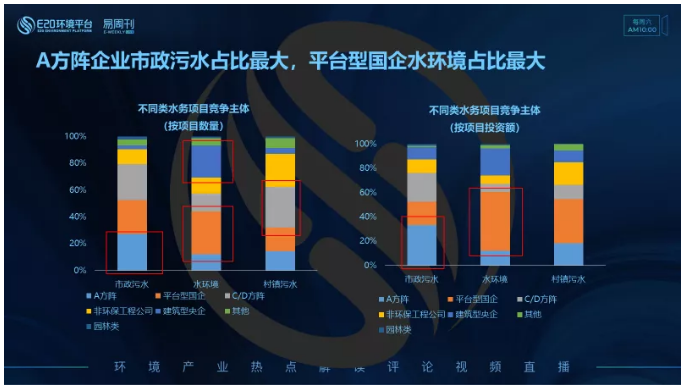 進(jìn)一步分析不同類型競(jìng)爭(zhēng)主體獲取不同類水務(wù)項(xiàng)目的傾向性可以發(fā)現(xiàn):2020年前三季度傳統(tǒng)水務(wù)A方陣企業(yè)在市政污水板塊競(jìng)爭(zhēng)優(yōu)勢(shì)最明顯,無(wú)論是項(xiàng)目數(shù)量還是所占市場(chǎng)份額占比均最大,在村鎮(zhèn)污水及水環(huán)境領(lǐng)域市場(chǎng)占比都相對(duì)較小。