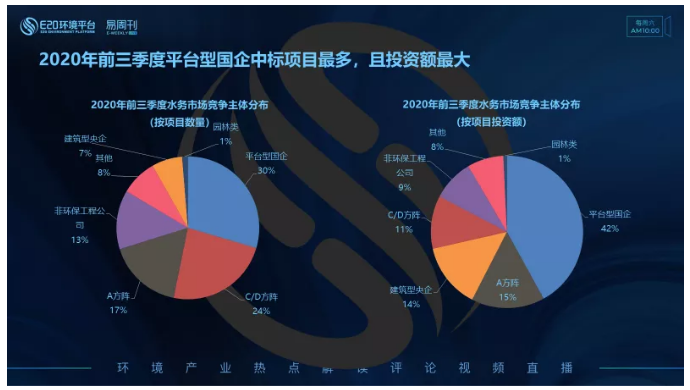 對(duì)比分析不同類企業(yè)在2020年前三季度水務(wù)市場(chǎng)中標(biāo)情況發(fā)現(xiàn):平臺(tái)型國(guó)企在水務(wù)市場(chǎng)所占的市場(chǎng)份額最大,投資額占比達(dá)42%;傳統(tǒng)水務(wù)A方陣企業(yè)項(xiàng)目數(shù)量及項(xiàng)目投資額占比分別為17%、15%;建筑型央企雖然項(xiàng)目數(shù)量占比僅7%,但投資額占比則僅次于傳統(tǒng)水務(wù)A方陣企業(yè),占比為14%;C/D方陣環(huán)保企業(yè)雖然中標(biāo)的項(xiàng)目數(shù)量占比24%,但投資額占比僅11%,這與其中標(biāo)項(xiàng)目的單體投資額有關(guān)。