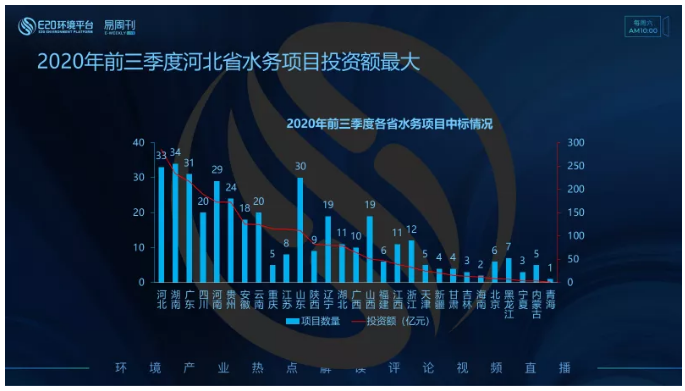 對(duì)比不同省份水務(wù)項(xiàng)目中標(biāo)情況,河北、湖南、廣東三省在2020年前三季度釋放的水務(wù)項(xiàng)目投資額排名前三,而項(xiàng)目數(shù)量排名前三的省份分別是湖南、河北和廣東。