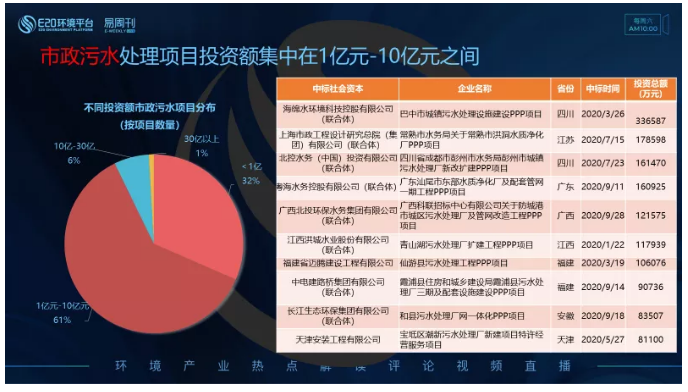 對(duì)市政污水類項(xiàng)目按不同投資額劃分(左圖),市政污水處理類項(xiàng)目的單體投資額多在“1億元-10億元”之間,占比達(dá)61%;其次是<1億的項(xiàng)目,占比32%;投資額>10億的市政污水類項(xiàng)目相對(duì)較少,占比僅7%。