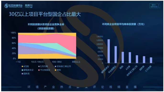 左圖,分析不同投資額區(qū)間水務(wù)項(xiàng)目中標(biāo)企業(yè)類型發(fā)現(xiàn),2020年前三季度,水務(wù)A方陣企業(yè)在小于30億項(xiàng)目中,隨著金額增加占比變化不明顯,當(dāng)項(xiàng)目投資額大于30億,占比明顯減小;C/D方陣企業(yè)則隨著項(xiàng)目投資額增加,占比不斷減小,在<1億的項(xiàng)目中,占比最大,由此說(shuō)明C/D方陣更傾向投資額相對(duì)較小的項(xiàng)目;平臺(tái)型國(guó)企在各個(gè)投資額區(qū)間均占了較大的市場(chǎng)份額,在30億以上項(xiàng)目中,占比最大,近70%。
