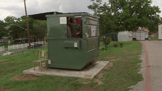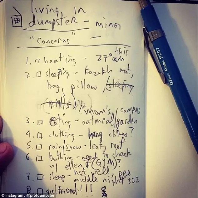 他飛跑去向教務(wù)長(zhǎng)申請(qǐng): “我想把校園草坪上的垃圾箱變成一個(gè)微小的可持續(xù)的家,并到里面去住。” 教務(wù)長(zhǎng)雖然不是很懂這個(gè)教授的腦回路,但是想想垃圾箱也不貴,就同意了。