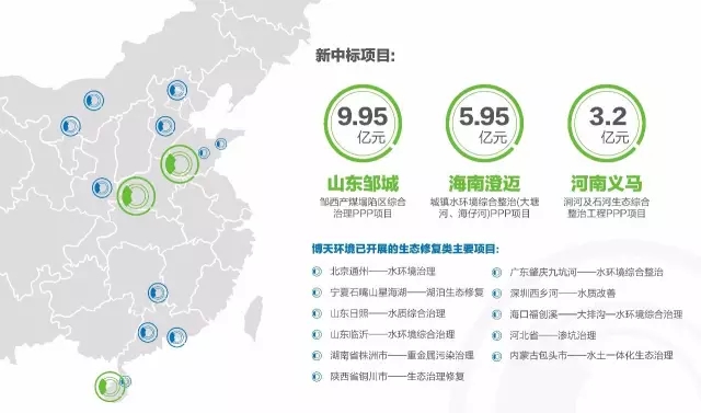 近日,博天環(huán)境集團(603603.SH)通過聯(lián)合體合作方式分別贏取了位于山東省鄒城市、河南省義馬市和海南省澄邁縣的三個生態(tài)修復類項目。其中山東省鄒城市鄒西產(chǎn)煤塌陷區(qū)綜合治理PPP項目,投資概算約9.95億元;河南省義馬市澗河及石河生態(tài)綜合整治工程(PPP),項目總投資約3.2億元;海南省澄邁縣城鎮(zhèn)水環(huán)境綜合整治(大塘河、海仔河)PPP項目,估算總投資5.95億元。