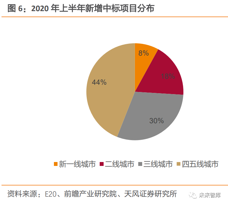 新增產(chǎn)能增速放緩,市場向四五線城市下沉趨勢明顯。2017 年以來,全國垃圾焚燒發(fā)電項目新增投產(chǎn)規(guī)模較大,如2019年新增投產(chǎn)高達 9.53 萬噸/日。但新增產(chǎn)能增速已由 2017年 53%下降至 2019年 10%。且從 2020 年上半年新增項目區(qū)域分布看,新增的42個垃圾焚燒發(fā)電項目中,一線城市無新增,四五線城市項目數(shù)量占比達 44%。表明隨著垃圾焚燒行業(yè)快速發(fā)展,一二線城市等經(jīng)濟較發(fā)達地區(qū)產(chǎn)能逐漸飽和,行業(yè)整體新增需求增速也有所放緩,市場擔憂行業(yè)成長性或不可持續(xù)。