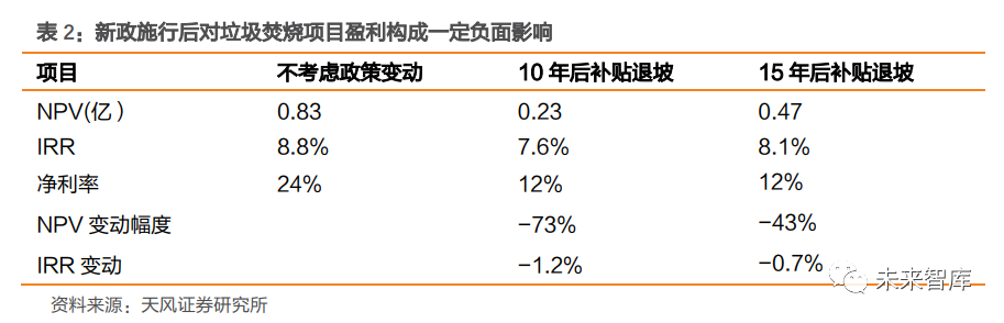 垃圾分類制度逐步推行,加劇市場憂慮。2019 年 4 月,《關(guān)于在全國地級及以上城市全面開展生活垃圾分類工作的通知》發(fā)布,全國地級及以上城市全面啟動生活垃圾分類工作。2020 年 12 月,住建部表示 46 個重點城市已基本建成生活垃圾分類系統(tǒng)。由于垃圾分類可將不同種類的生活垃圾,分別進行投放、收集、運輸直至處理處置,市場擔心隨著垃圾 分類制度進一步推行,濕垃圾、可回收垃圾等資源化利用量提高,生活垃圾焚燒處置量會 有所下滑。例如,上海在實行分類政策后,2019 年日均干垃圾處置量 17731 噸,較 2018 年底減少 17.5%。1.2. 國補靴子落地,垃圾焚燒企業(yè)盈利性短期承壓電價補貼是垃圾焚燒廠重要收入來源之一。為支持可再生能源,我國依據(jù)《可再生能源法》,對可再生能源采用固定電價政策,電價差異由國家專門設(shè)立的可再生能源電價附加補足。以垃圾焚燒發(fā)電項目為例,政策規(guī)定全國統(tǒng)一垃圾發(fā)電標桿電價0.65 元/Kwh,高出當?shù)孛摿蛉济簷C組標桿上網(wǎng)電價(0.35 元/Kwh 左右)的部分,實行兩級分攤,當?shù)厥〖夒娋W(wǎng)負擔 0.1 元/Kwh,其余由可再生能源電價附加解決。目前可再生能源補貼工作正有序推進, 包括垃圾發(fā)電項目在內(nèi)的存量生物質(zhì)項目正逐步納入補貼清單,2020 年新增生物質(zhì)項目清單也于 2020 年 11 月公布,共有 46 個新增垃圾發(fā)電項目納入 2020 年補貼清單,裝機規(guī)模 1163MW。國補靴子落地,將“合理利用小時數(shù)”作為補貼發(fā)放測算標準。2020 年 9 月,三部委發(fā)布《關(guān)于<關(guān)于促進非水可再生能源發(fā)電健康發(fā)展的若干意見>有關(guān)事項的補充通知》?!锻ㄖ反_定各類項目全生命周期合理利用小時數(shù),在合理利用小時的基礎(chǔ)上,項目全生命周期補貼電量=項目容量×項目全生命周期合理利用小時數(shù)。其中,項目容量按核準(備案)時確定的容量為準。如項目實際容量小于核準(備案)容量的,以實際容量為準。新政施行后對垃圾焚燒項目盈利構(gòu)成一定負面影響。我們對一個日處置量 1000 噸的垃圾焚燒項目進行了測算,新政施行后,假設(shè)在項目運營滿 15 年后,標桿上網(wǎng)電價按 0.45 元 /度確認,項目的 IRR/NPV 將分別減少 0.7%/43%;而對于優(yōu)質(zhì)的垃圾焚燒項目,其利用小時數(shù)較高,假設(shè)其運營 10 年后已滿足 82500 的全生命周期合理利用小時數(shù),從第 11 年 起,標桿上網(wǎng)電價按 0.45 元/度確認,則項目的 IRR/NPV 將分別減少 1.2%/73%。從凈利率的角度,按 0.45 元/度確認標桿上網(wǎng)電價后,項目凈利率將降低 12 %左右。