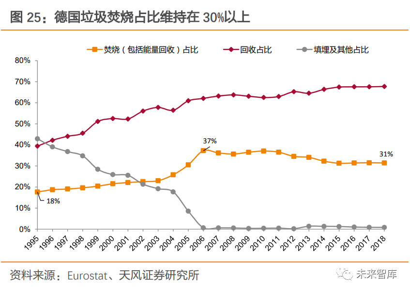 2.1.3. 德國:重視回收循環(huán),“零填埋”政策下焚燒量較穩(wěn)定德國較早開始實施垃圾分類,回收利用率較高。1992 年,德國在全國建立“綠點制”回收系統(tǒng),與各生產(chǎn)企業(yè)合作,將印有綠點標記的、具有再生價值的包裝物回收再利用。2011 年,已經(jīng)有 1.6 萬家德國包裝生產(chǎn)和使用企業(yè)加入了綠點系統(tǒng),超過 90%的商品外包裝印上了綠點標記。分類制度推行下,德國城市垃圾總產(chǎn)生量控制良好,由 2002 年的 5277 萬噸變動至 2018 年 5030 萬噸,城市垃圾回收利用率也從 2002 年 56%上升至 2018 年 67%。