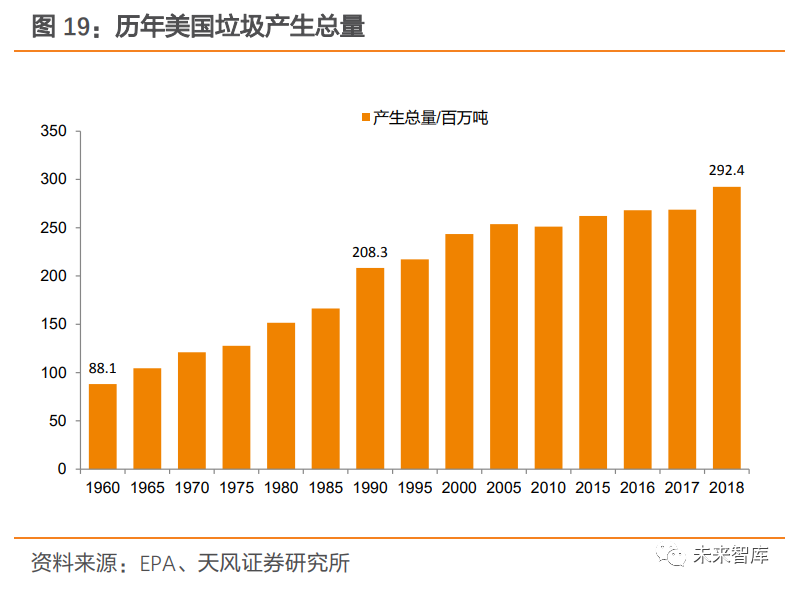 2.1.2. 美國:以填埋為主,焚燒占比維持在 12%左右美國垃圾產(chǎn)生總量及人均垃圾產(chǎn)量趨于平穩(wěn)。1990 年,美國開始建立資源垃圾分類回收系統(tǒng),人均垃圾產(chǎn)量在實行垃圾分類后開始逐步趨于穩(wěn)定,1990 年人均垃圾產(chǎn)量為 4.57 磅/ 每天,2018年為 4.9 磅/每天;垃圾產(chǎn)生總量則由 1990 年 208.3 百萬噸增加至 2018 年 292.4 百萬噸。