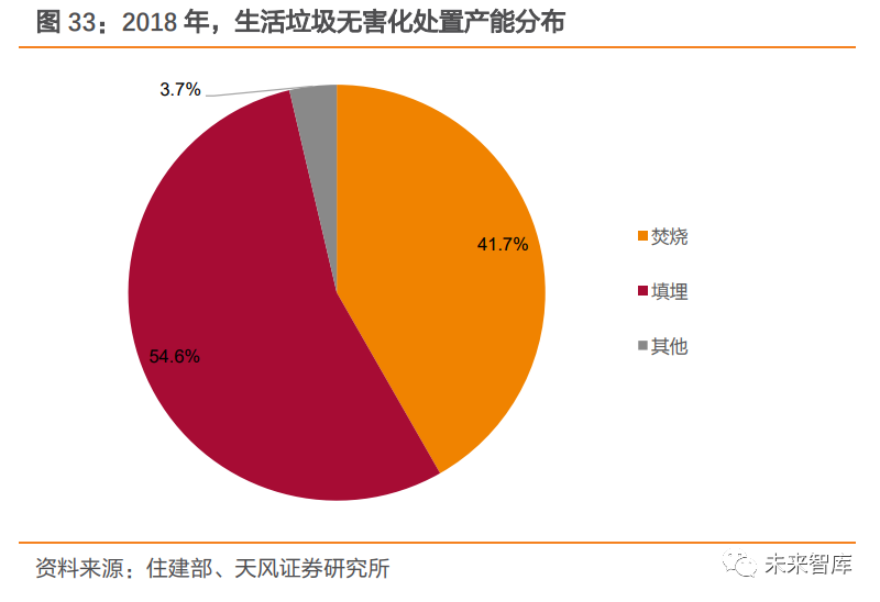 垃圾填埋是垃圾焚燒的最主要競爭工藝,近年來產(chǎn)能增速明顯放緩。生活垃圾無害化處置方式主要包括填埋、焚燒、堆肥等。2018 年,填埋和焚燒處置產(chǎn)能占無害化處置產(chǎn)能的比例分別為 54.6%、41.7%。填埋在早期因技術(shù)簡單、成本低等特點得到大規(guī)模應用,但占地面積較大,與緊缺的土地資源天然具有對抗性,近年來產(chǎn)能增速明顯放緩;焚燒具有占地面積小、能源利用高等特點,對垃圾填埋的替代作用逐年顯現(xiàn),產(chǎn)能占比持續(xù)提升。