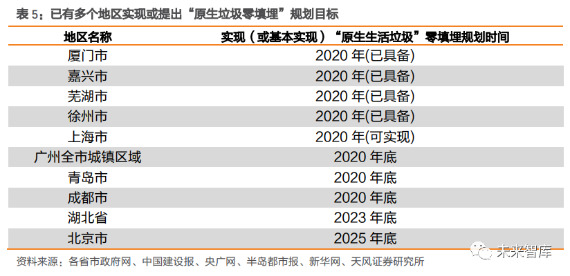 土地資源緊張+選址困難,填埋產(chǎn)能新增難度較大。一方面,我國土地資源較為緊張,城鎮(zhèn)化又進一步壓縮了城市公用設(shè)施用地的供給空間,垃圾填埋廠用地受限。另一方面,垃圾填埋場選址難度較大,需考量地質(zhì)、地形、水文、氣候、城市規(guī)劃、交通運輸?shù)雀黝愐蛩?,不符合《生活垃圾衛(wèi)生填埋處理技術(shù)規(guī)范》等相關(guān)規(guī)定中選址要求的填埋場,很可能無法滿足環(huán)評要求,填埋產(chǎn)能新增難度較大。環(huán)保治理力度加大+填埋場超負荷運行,垃圾填埋存量項目封場提速。非正規(guī)垃圾填埋場由于配套設(shè)施不健全、執(zhí)行標準缺失、不規(guī)范填埋作業(yè)等多種原因,對周邊環(huán)境存在著較為嚴重的污染隱患。隨著居民環(huán)保訴求提升以及政府層面環(huán)保治理力度加大,不符合環(huán)保要求的填埋場陸續(xù)被關(guān)停。我國在《“十二五”全國城鎮(zhèn)生活垃圾無害化處理設(shè)施建設(shè)規(guī)劃》首次提出存量垃圾治理,預計實施存量治理項目 1882 個,衛(wèi)生填埋場封場項目有 802 個?!笆逡?guī)劃”預計實施存量治理項目 803 個。此外,垃圾填埋場超負荷運轉(zhuǎn)現(xiàn)象突出,庫容趨飽和,加速封場進程。由于近些年垃圾產(chǎn)量增速較高,以及部分地區(qū)焚燒設(shè)施尚在規(guī)劃建設(shè)中,垃圾填埋場超負荷運轉(zhuǎn)現(xiàn)象突出, 庫容加速飽和,需提前封場。以 2020 年 2 月封場的西安市江村溝垃圾填埋場為例,作為曾經(jīng)國內(nèi)以及亞洲最大的垃圾填埋場,其設(shè)計日處理量 2600 噸。但隨著城市發(fā)展以及人口快速增長,垃圾處理量已由建成之初的 800 噸/日上升至 2019 年 10000 噸/日左右,超負荷運轉(zhuǎn)下提前 20 年迎來飽和。垃圾填埋“新增難+存量減”背景下,垃圾焚燒替代屬性凸顯,產(chǎn)能占比有望進一步提升。 垃圾焚燒作為垃圾填埋的最主要替代方式,具有占地面積小、處理效率高、環(huán)境污染小、 能源利用高等多方面優(yōu)勢。2020 年 8 月,國家發(fā)展改革委、住房城鄉(xiāng)建設(shè)部和生態(tài)環(huán)境部 等三部委聯(lián)合印發(fā)《城鎮(zhèn)生活垃圾分類和處理設(shè)施補短板強弱項實施方案》,明確提出“原 則上地級以上城市以及具備焚燒處理能力的縣(市、區(qū)),不再新建原生生活垃圾填埋場, 現(xiàn)有生活垃圾填埋場主要作為垃圾無害化處理的應急保障設(shè)施使用?!苯刂聊壳?,已有多個省市提出“原生生活垃圾零填埋”的規(guī)劃目標,垃圾焚燒替代屬性凸顯。