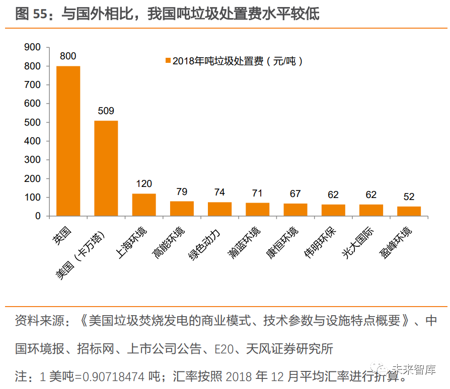 相較于流化床技術(shù),爐排爐技術(shù)因垃圾瀝水量較多、鍋爐效率較高等原因,具有更高的噸上網(wǎng)量,從而帶動垃圾焚燒發(fā)電企業(yè)盈利能力提升。中溫次高壓技術(shù)逐步得到推廣。在過去,受限于生活垃圾的復雜性以及焚燒發(fā)電技術(shù)處理水平有限,國內(nèi)垃圾焚燒電廠基本采用中溫中壓蒸汽參數(shù)來防止過熱器等受熱面管高溫腐蝕。但據(jù)《生活垃圾焚燒廠噸垃圾發(fā)電量的研究分析》研究表明,垃圾熱值相近的情況下, 使用中溫次高壓參數(shù)時發(fā)電量更高。隨著我國垃圾分類的推進及焚燒發(fā)電技術(shù)日益成熟, 部分焚燒廠率先使用中溫次高壓技術(shù)來提高發(fā)電效率。例如在 2009 年,深能源投資的武漢市江北西部垃圾焚燒廠、福建創(chuàng)冠投資的湖北黃石垃圾焚燒發(fā)電廠、在建的北京廊坊垃圾焚燒發(fā)電項目等先后采用中溫次高壓技術(shù),在國內(nèi)掀起應用熱潮,中溫次高壓技術(shù)也逐步得到推廣,進一步提升噸發(fā)電量。3.2.3. 噸發(fā)電量較國外仍有較大提升空間我國噸發(fā)電量較發(fā)達國家仍有差距,未來提升空間較大。深圳市生活垃圾處理監(jiān)管中心發(fā)布的文章顯示,美國生活垃圾熱值可達到我國目前平均水平的兩倍,美國生活垃圾焚燒噸發(fā)電量也在 600kWh 以上,表明我國生活垃圾熱值及噸發(fā)電量仍有較大提升空間。展望未來,垃圾分類制度仍在持續(xù)推進,焚燒企業(yè)的處理工藝仍在不斷優(yōu)化,噸發(fā)電量提升未來可期,垃圾焚燒企業(yè)盈利能力有望得到持續(xù)優(yōu)化。
