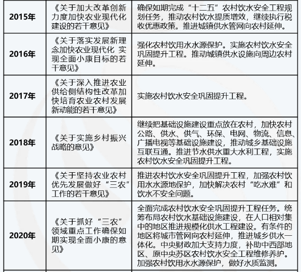到2020年,中央一號(hào)文件將“提高農(nóng)村供水保障水平”單獨(dú)列出,作為30項(xiàng)實(shí)實(shí)在在的重點(diǎn)工作之一,一方面對(duì)農(nóng)村飲水安全鞏固提升工程任務(wù)提出全面完成的要求,再次強(qiáng)調(diào)有條件的地區(qū)推進(jìn)城鄉(xiāng)供水一體化;另一方面表明中央財(cái)政將加大財(cái)政力度,在農(nóng)水工程的維修養(yǎng)護(hù)上會(huì)補(bǔ)助一些經(jīng)濟(jì)欠發(fā)達(dá)的地區(qū)。