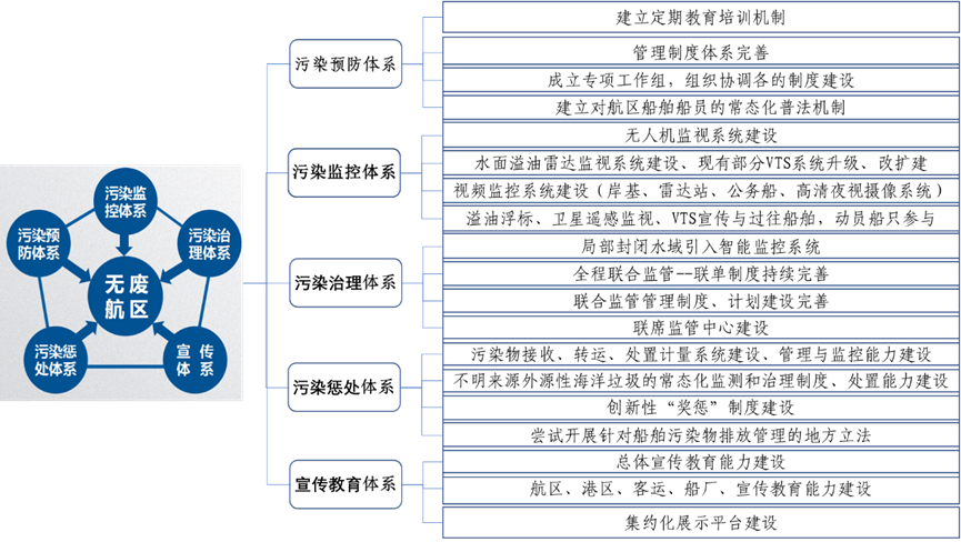 針對船舶污染物產生量大、監(jiān)管難、海陸處置體系銜接不暢的問題,威海市堅持目標導向和問題導向,聚焦主要矛盾,精準靶向破題攻堅,建設性地提出在成山頭水域探索建設“無廢航區(qū)”,總結提煉出“無廢航區(qū)3456”建設模式。三個階段性目標和船舶固廢三大管控流程。三個階段性目標即到2020年底,在成山頭“兩制”水域內探索構建船舶“防-控-治-懲-宣”五環(huán)管理體系,“無廢航區(qū)”模式初步建立。到2025年底,將“無廢航區(qū)”模式擴展到石島東南、成山頭西北部兩個水域,綠色航區(qū)發(fā)展成效顯著。到2035年底,在威海市管轄海域全面建成“無廢航區(qū)”,船舶產生的各類廢物全面實現精細化管理和無害化處置。船舶固廢三大管控流程即實現船舶固廢源頭減量和控制、實現船舶固廢遷移過程控制、實現海陸界面和海上治理處置。 “四零四全”工作目標體系。即航區(qū)內實現船舶生活垃圾‘零’排放、船舶壓載水和沉積物‘零’置換、船舶油污水(殘油、油渣)‘零’排放、船舶有毒有害物質‘零’排放”,船員教育全覆蓋、船舶監(jiān)控全覆蓋、航區(qū)巡航全覆蓋、污染處置全覆蓋。“防-控-治-懲-宣”五環(huán)管理體系。即建立船舶污染預防體系。按照國際海事組織(IMO)關于船舶污染防治各項要求,開展《國際防止船舶造成污染公約》《國際控制船舶有害防污底系統(tǒng)公約》《國際油污防備反應和合作公約》等公約和我國法律法規(guī)實施宣貫,制定并實施《威海市船舶污染物接收、轉運和處置聯單制度(試行)》,完善船舶污染物管理機制,構建船舶污染預防體系。建立船舶污染監(jiān)控體系,通過衛(wèi)星遙感、無人機空中監(jiān)控、船舶交通管理系統(tǒng)(VTS)、船舶自動識別系統(tǒng)(AIS)、視頻監(jiān)控系統(tǒng)、海巡船巡航執(zhí)法等建立航區(qū)內船舶污染陸??仗煲惑w化立體監(jiān)視監(jiān)控體系。建立船舶污染治理體系,全面開展船舶“碧海藍天”行動,加強船舶污染防治聯合監(jiān)管力度;地方政府投資建設了兩個海上污染處置設備庫,海事、海洋、環(huán)保、住建、應急等部門聯合開展海上污染處理和處置,打造船舶污染綜合治理體系。建立船舶外源性污染懲處體系,開展到港船舶非法排污倒查、在航船舶非法排污全國協(xié)查等,對航區(qū)內船舶違法行為,采取行政處罰、船舶滯留、船員記分等行政強制手段,實施從嚴懲處。建立“無廢航區(qū)”宣傳體系,開展“無廢航區(qū)”環(huán)保宣傳進校園、進企業(yè)活動;通過甚高頻通信系統(tǒng)、海岸電臺等對航區(qū)內船員進行環(huán)保宣傳;開展成山頭航海博物館“無廢航區(qū)”展覽區(qū)建設,拓展海洋環(huán)保宣傳新途徑。圖 9 “無廢航區(qū)”五環(huán)管理體系圖 10 “無廢航區(qū)”海陸空天一體化污染監(jiān)控體系示意圖