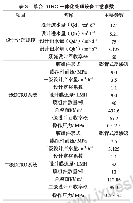 兩級DTRO系統(tǒng)包含了 4臺兩級DTRO 一體化處理設(shè)備,每臺設(shè)備的主要工藝參數(shù)見表3。