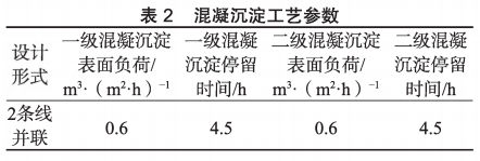 預(yù)處理包含了曝氣改性、兩級混凝沉淀和混凝氣浮,混凝沉淀的主要工藝參數(shù),見表2。