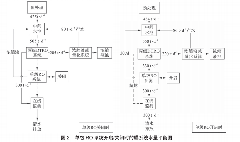 視兩級DTRO系統(tǒng)出水氨氮是否超標(biāo),選擇是否開啟單級RO系統(tǒng)。當(dāng)兩級DTRO系統(tǒng)出水氨氮靖,關(guān)閉RO系統(tǒng)此時(shí)系竝體回收率為70.59%;當(dāng)兩級DTRO出水氨氮值超標(biāo),開啟RO系統(tǒng),此 時(shí)系統(tǒng)整體回收率為69.12%。量平衡見圖2。
