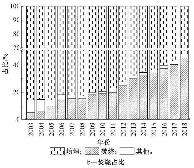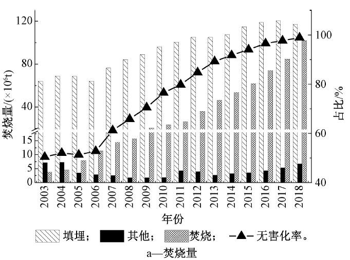 圖1 中國(guó)垃圾焚燒廠建設(shè)規(guī)模2)焚燒量的發(fā)展:隨著垃圾焚燒廠的建設(shè),我國(guó)垃圾無害化處置能力和處置量不斷提高。2003年我國(guó)垃圾無害化量為0.75億t,無害化率為50.4%,到2018年垃圾無害化量達(dá)到2.26億t,處理率達(dá)到99%(圖2a)。垃圾年焚燒量從2003年的370萬t發(fā)展到2018年的1.02億t(圖2a)。垃圾焚燒量占無害化處理總量的比例從2003年的4.9%發(fā)展到2018年的45.1%。而且根據(jù)行業(yè)估計(jì)到2020年超過50%(圖2b)。據(jù)此,我國(guó)將很快進(jìn)入“焚燒為主,填埋托底”的垃圾終端處理格局。