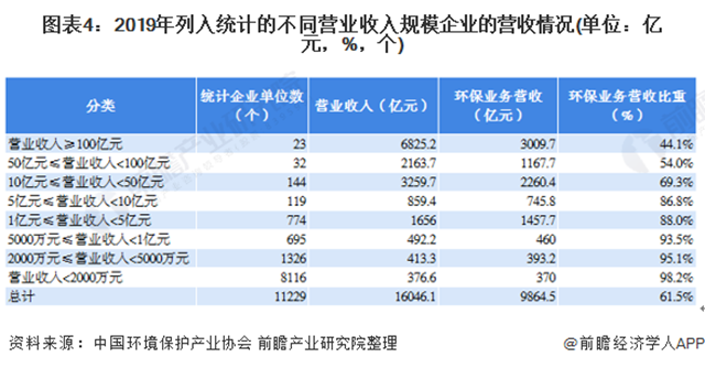 營(yíng)業(yè)收入規(guī)模越小的企業(yè),環(huán)保業(yè)務(wù)營(yíng)業(yè)收入在總營(yíng)業(yè)收入中所占比重越高,其環(huán)保專業(yè)化程度也越高,營(yíng)業(yè)收入超過l00億元的企業(yè),環(huán)保業(yè)務(wù)營(yíng)業(yè)收入平均占比為44.l%,營(yíng)業(yè)收入小于2000萬元的企業(yè),其環(huán)保業(yè)務(wù)營(yíng)業(yè)收入平均占比達(dá)98.2%。