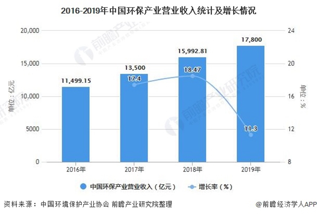 盡管受到2018年產(chǎn)業(yè)發(fā)展流動(dòng)性危機(jī)余波及中美貿(mào)易摩擦的影響,2019年一些環(huán)保企業(yè)依然面臨著經(jīng)營(yíng)危機(jī),但總體來看,2019年環(huán)保產(chǎn)業(yè)整體發(fā)展態(tài)勢(shì)趨好,持續(xù)保持了較快發(fā)展。據(jù)中國(guó)環(huán)境保護(hù)產(chǎn)業(yè)協(xié)會(huì)測(cè)算數(shù)據(jù),2019年全國(guó)環(huán)保產(chǎn)業(yè)營(yíng)業(yè)收入約17800億元,較2018年增長(zhǎng)約11.3%。