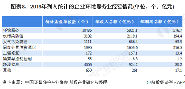 據(jù)我國(guó)環(huán)境保護(hù)產(chǎn)業(yè)協(xié)會(huì)統(tǒng)計(jì)數(shù)據(jù),2019年1492家固廢處置與資源化企業(yè)實(shí)現(xiàn)營(yíng)業(yè)收入6591.7億元,實(shí)現(xiàn)營(yíng)業(yè)利潤(rùn)598.3億元;3372家水污染防治企業(yè)實(shí)現(xiàn)營(yíng)業(yè)收入5676.3億元,實(shí)現(xiàn)營(yíng)業(yè)利潤(rùn)539.2億元;1366家大氣污染防治企業(yè)實(shí)現(xiàn)營(yíng)業(yè)收入1904.7億元,實(shí)現(xiàn)營(yíng)業(yè)利潤(rùn)143.1億元。