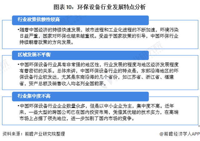 環(huán)保設(shè)備行業(yè)的發(fā)展共有三大特點(diǎn),分別是政策依賴性較高、區(qū)域發(fā)展不平衡及市場(chǎng)分散,競(jìng)爭(zhēng)激烈。具體分析如下:
