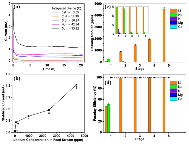 圖2.(a)提鋰過(guò)程中每一級(jí)的計(jì)時(shí)電流曲線,曲線與時(shí)間的積分即為該過(guò)程中遷移的總電荷量;(b)提鋰過(guò)程中穩(wěn)定電流與原料鋰濃度的關(guān)系;(c)提鋰過(guò)程中每一級(jí)的離子通過(guò)量;插圖顯示情節(jié)在低范圍內(nèi),以幫助查看干擾離子的結(jié)果:(d)提鋰過(guò)程中每一級(jí)中不同離子的遷移對(duì)電流的貢獻(xiàn)率。實(shí)心方塊表示總體效率(100%)。