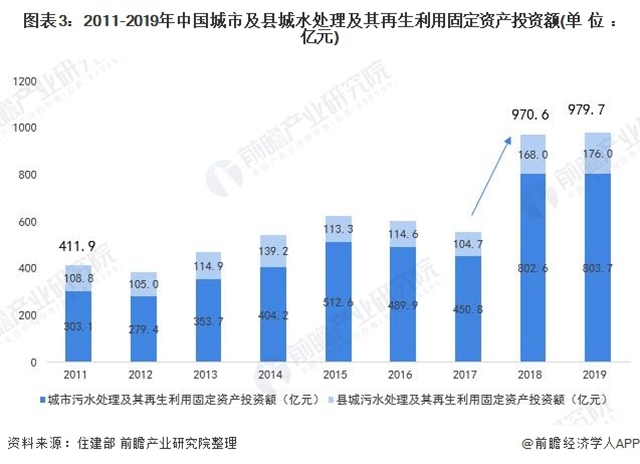 在投資額方面,2011-2017年,我國城市及縣城污水處理及其再生利用固定資產(chǎn)投資額維持在350-650億元區(qū)間范圍內(nèi)。2018年,我國城市及縣城污水處理及其再生利用固定資產(chǎn)投資額大幅增長,達到970.6億元,2019年投資額再創(chuàng)新高,達到979.7億元。