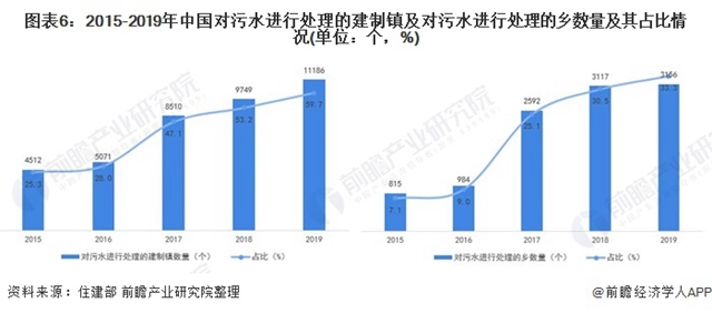 據(jù)住建部發(fā)布的《城鄉(xiāng)建設(shè)統(tǒng)計年鑒》統(tǒng)計數(shù)據(jù)顯示,2015年以來,我國農(nóng)村地區(qū)對污水進行處理的建制鎮(zhèn)及鄉(xiāng)數(shù)量不斷增加。截止2019年底,對污水進行處理的建制鎮(zhèn)及鄉(xiāng)的數(shù)量分別為11186個和3156個。