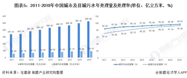 截止2019年底,我國城市及縣城年污水處理量分別達到了525.85億立方米和95.01億立方米,污水處理率分別達到了96.81%和93.55%。城市及縣城污水處理率已經(jīng)提前完成了“十三五”時期規(guī)劃的污水處理率目標(“十三五”規(guī)劃目標:到2020年底,城市污水處理率目標為95%,縣城污水處理率目標為85%,東部地區(qū)縣城力爭達到90%)。