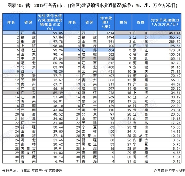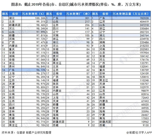 注:污水處理率為前瞻根據(jù)住建部公布的各省(市、自治區(qū))城市污水排放量及污水處理量數(shù)據(jù)進行的測算,污水處理率=各省(市、自治區(qū))城市污水處理量/污水排放量。